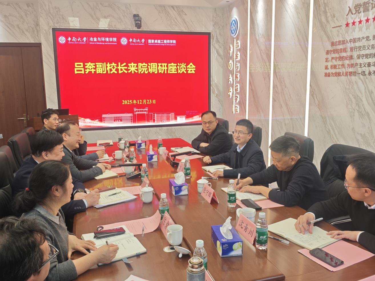 12月23日下午,校党委常委、副校长吕奔到冶金与环境学院开展调研,学院领导班子全体成员参加会议。资产经营有限公司党委书记张宁辉、出版社社长林绵优、研究生院副院长沈青川陪同参加调研。