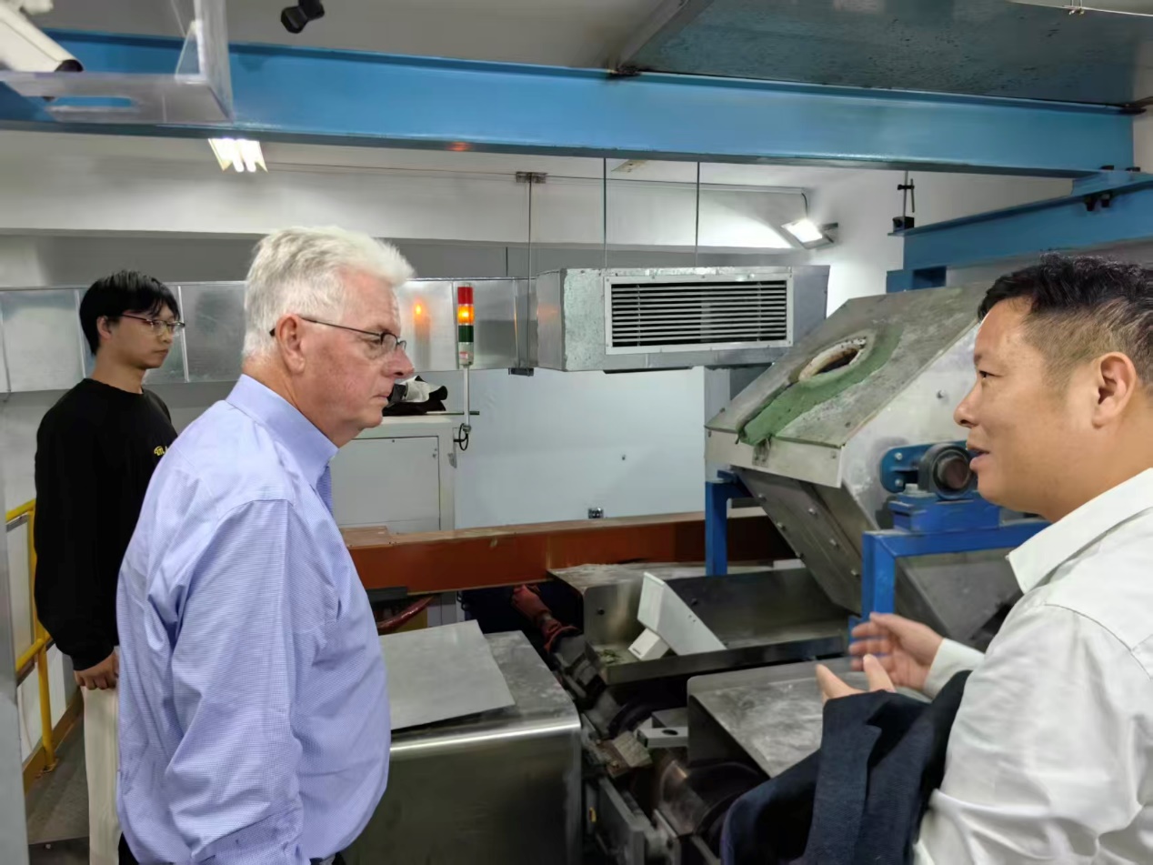 下午,在王万林教授的带领下,Cramb院士走进中南大学冶金与环境学院钢铁所实验室。Cramb院士从事材料科学和工程研究40多年,在钢铁初始凝固行为、液态氧化物凝固、清洁钢生产以及连续铸造的初始凝固现象方面开展了许多开创新研究并有着诸多独到见解。他在参观过程中仔细观察实验设备,与王万林教授深入交流钢铁冶金前沿技术,对实验室的研究条件和科研成果给予高度评价。